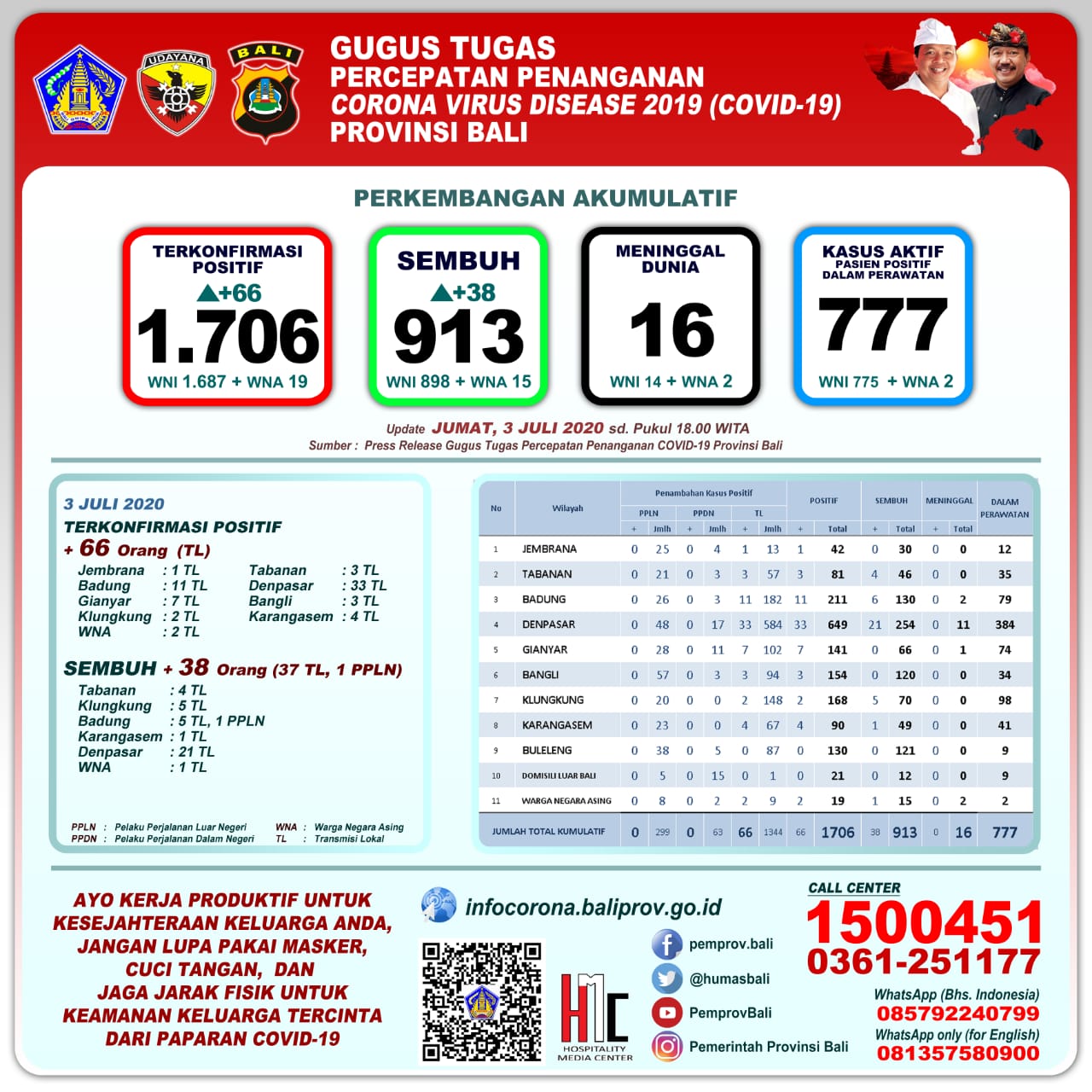 UPDATE KASUS COVID-19 DI KOTA DENPASAR, JUMAT, 3 JULI 2020 DENPASAR – Angka kesembuhan pasien Covid-19 di Kota Denpasar terus meningkat. Dimana, tercatat jumlah