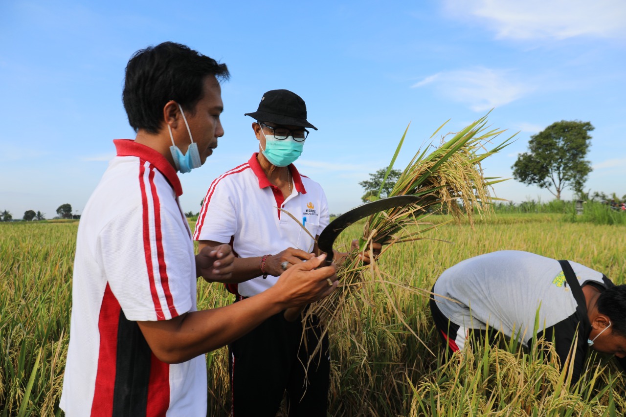 MANGUPURA – Kepala Dinas Pertanian dan Tanaman Pangan Kabupaten Badung, I Wayan Wijana, melakukan pemotongan rinai padi organik di Subak Ayunan Abiansemal, Jumat (15/10/2021). Turut hadir dalam panen tersebut Duta Farming dari ITB Made Marna, Pekaseh Ayunan I Ketut Parwata, Babinsa dan Kapolsek Abiansemal.