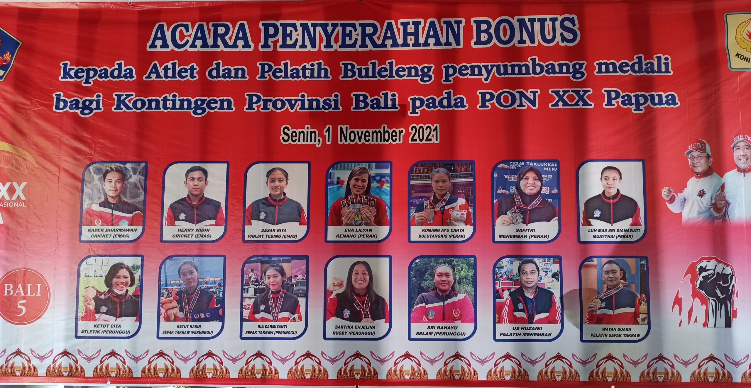 BULELENG – Wakil Bupati Buleleng, dr. I Nyoman Sutjidra, Sp.OG, secara langsung memberikan bonus kepada pelatih dan atlet Buleleng yang telah mengharumkan nama Buleleng