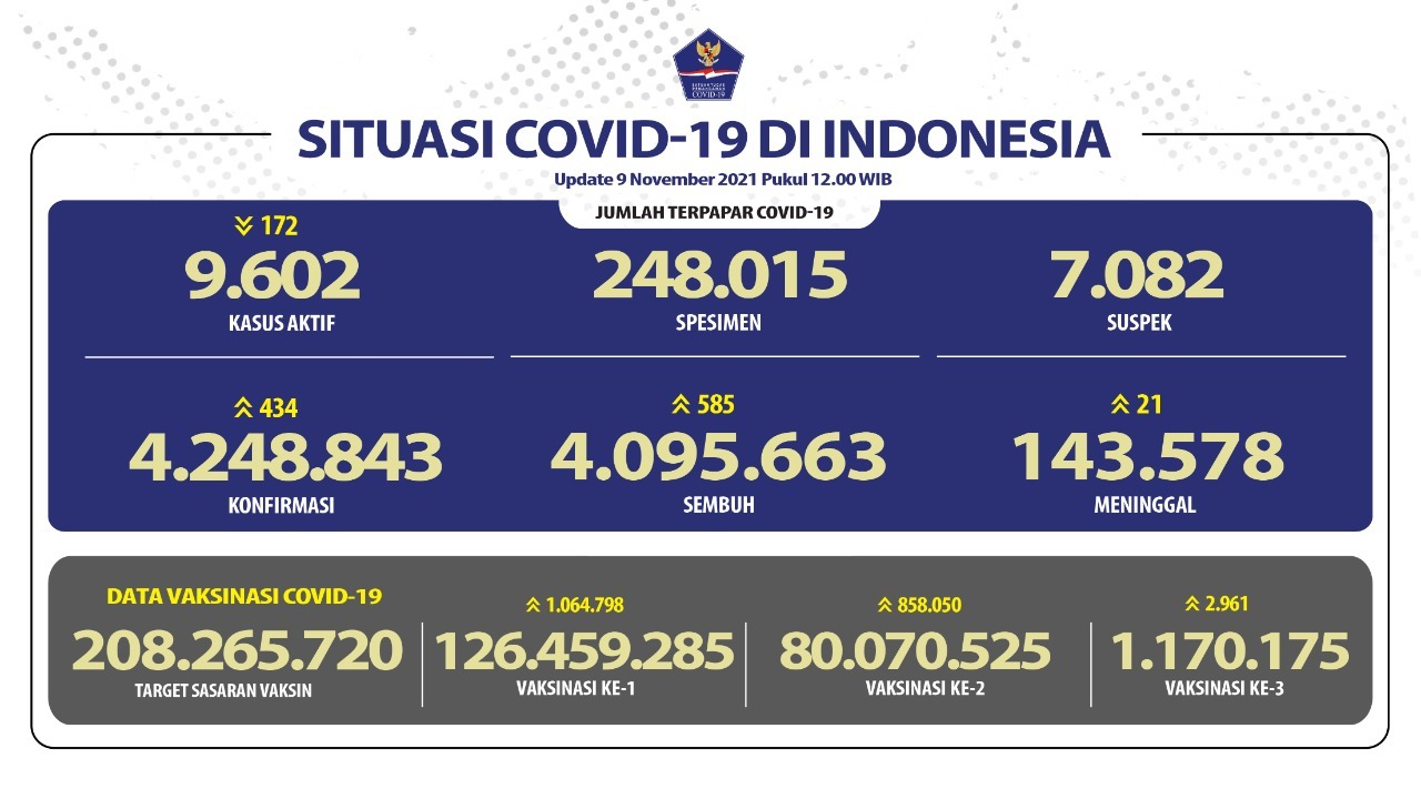 I. Nasional : 1). Konfirmasi 434 orang, sehingga menjadi 4.248.843 orang. 2). Sembuh 585 orang, sehingga menjadi 4.095.663 orang. 3). Meninggal 21 orang, sehingga