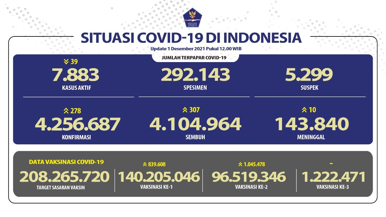 I. Nasional : 1). Konfirmasi 278 orang, sehingga menjadi 4.256.687 orang. 2). Sembuh 307 orang, sehingga menjadi 4.104.964 orang. 3). Meninggal 10 orang, sehingga
