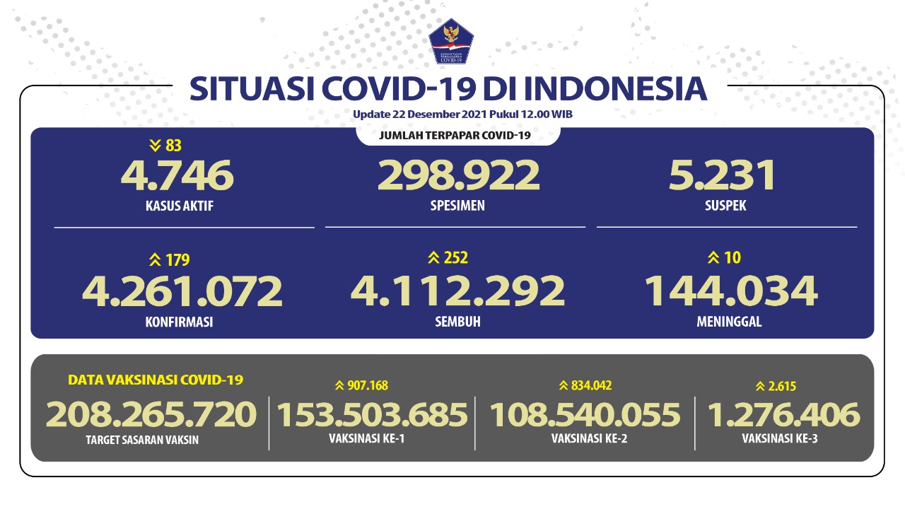 I. Nasional : 1). Konfirmasi 179 orang, sehingga menjadi 4.261.072 orang. 2). Sembuh 252 orang, sehingga menjadi 4.112.292 orang. 3). Meninggal 10 orang, sehingga