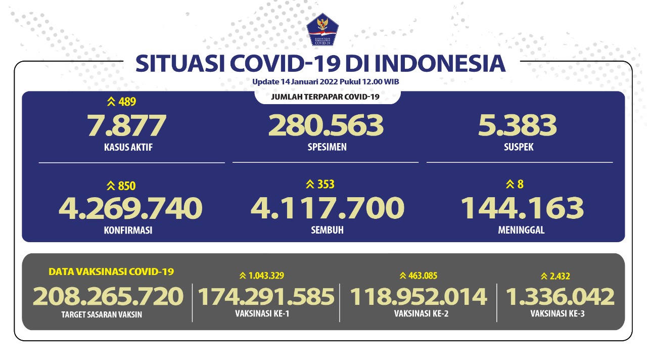 I. Nasional : 1). Konfirmasi 850 orang, sehingga menjadi 4.269.740 orang. 2). Sembuh 353 orang, sehingga menjadi 4.117.700 orang. 3). Meninggal 8 orang, sehingga