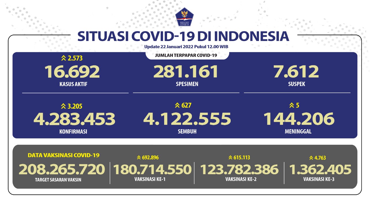 I. Nasional : 1). Konfirmasi 3.205 orang, sehingga menjadi 4.283.453 orang. 2). Sembuh 627 orang, sehingga menjadi 4.122.555 orang. 3). Meninggal 5 orang, sehingga