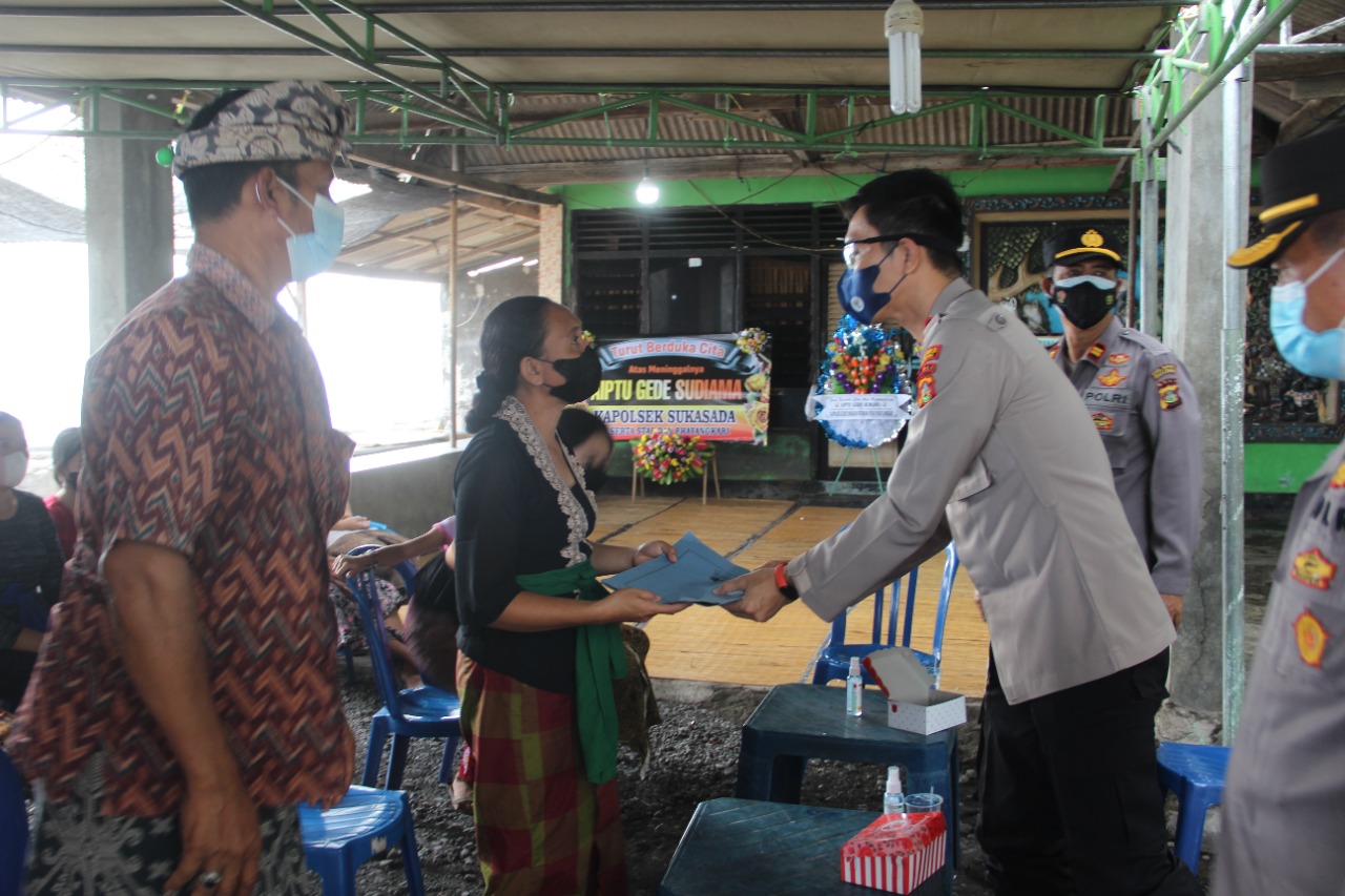 Setelah itu Kapolres AKBP Andrian memberikan tali kasih berupa donasi serta kain putih kuning dan beberapa dus air mineral. “Tali kasih diberikan sebagai bentuk turut berduka dan ini sebagai bentuk kepedulian kami dari seluruh personel Polres Buleleng kepada almarhum dan keluarga almarhum,” kata Kapolres.
