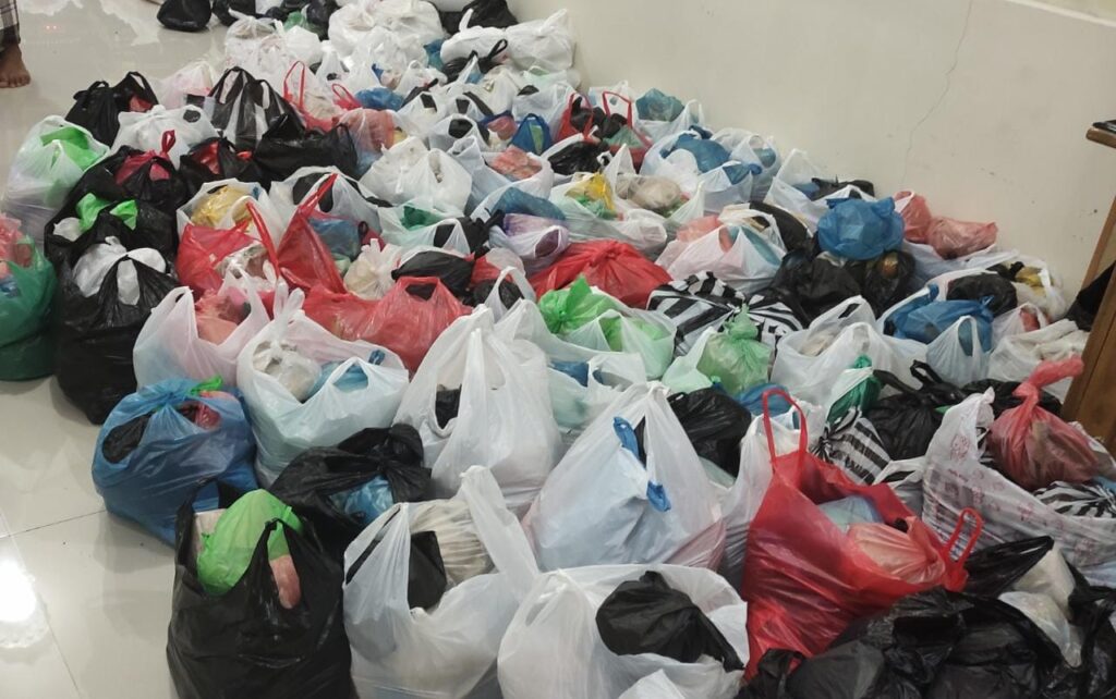 Ibu-ibu juga tak kalah bahagianya dalam menyiapkan sajian berupa nasi yang dibungkus, dan juga jajan yang dibungkus. Setiap ibu membawa minimal dua bungkus, baik itu jajan maupun nasi. Itulah yang nanti dibagikan kepada warga yang hadir di masjid sampai usainya acara peringatan Isra Mi’raj ini.