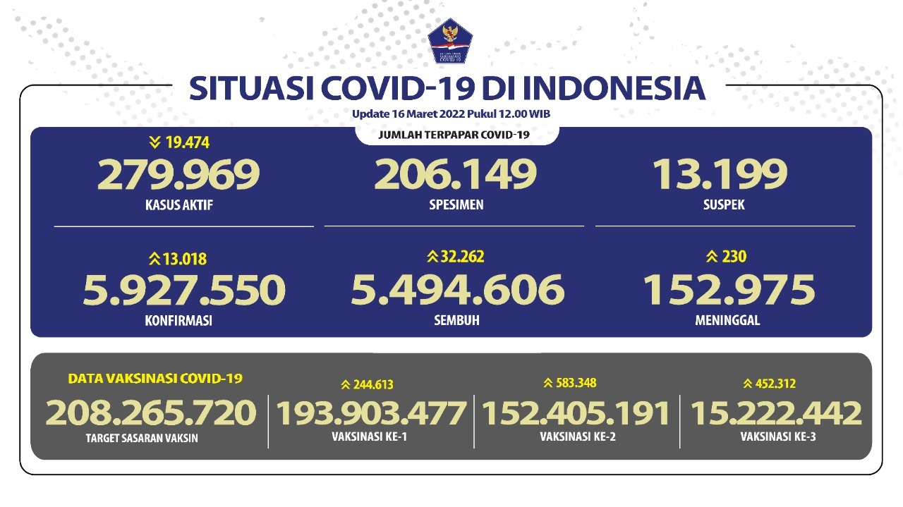 I. Nasional : 1). Konfirmasi 13.018 orang, sehingga menjadi 5.927.550 orang. 2). Sembuh 32.262 orang, sehingga menjadi 5.494.606 orang. 3). Meninggal 230 orang, sehingga
