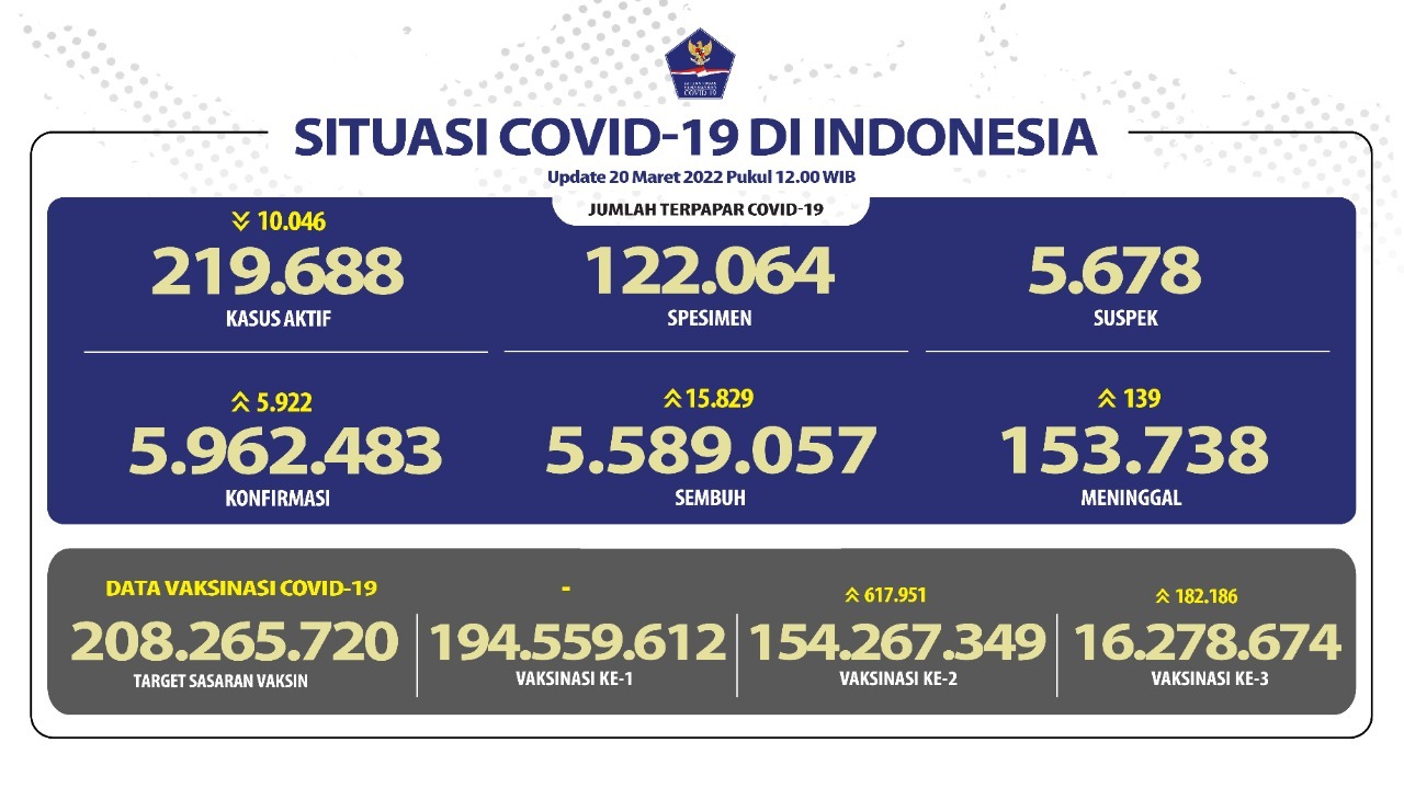I. Nasional : 1). Konfirmasi 5.992 orang, sehingga menjadi 5.962.483 orang. 2). Sembuh 15.829 orang, sehingga menjadi 5.589.057 orang. 3). Meninggal 139 orang, sehingga