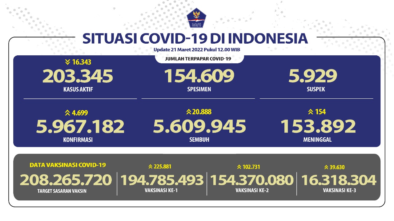 I. Nasional : 1). Konfirmasi 4.699 orang, sehingga menjadi 5.967.182 orang. 2). Sembuh 20.888 orang, sehingga menjadi 5.609.945 orang. 3). Meninggal 154 orang, sehingga