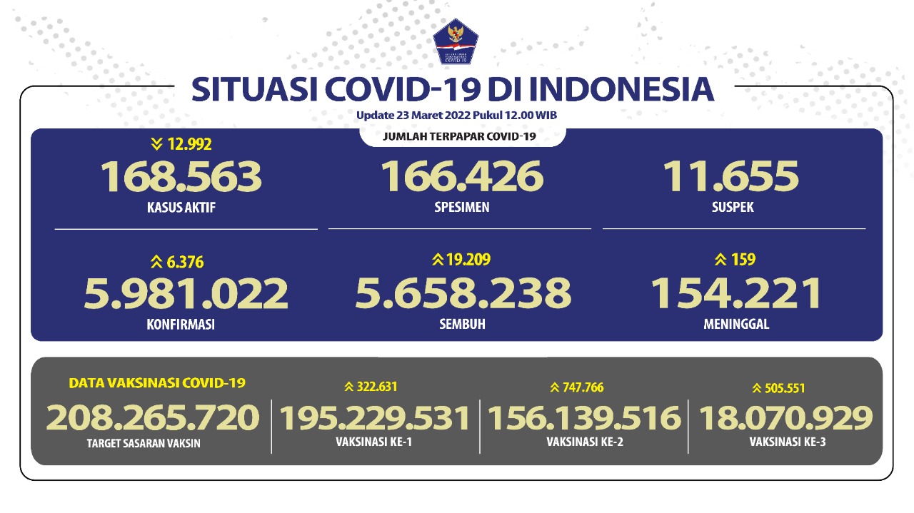 I. Nasional : 1). Konfirmasi 6.376 orang, sehingga menjadi 5.981.022 orang. 2). Sembuh 19.209 orang, sehingga menjadi 5.658.238 orang. 3). Meninggal 159 orang, sehingga