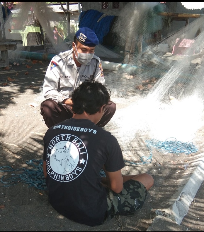 BULELENG – Anggota Sat Polairud Polres Buleleng Pos Anturan, Bripka Gede Tunas, melaksanakan giat sambang warga nelayan (Bang Wayan) di Banjar Labak, Desa Anturan,