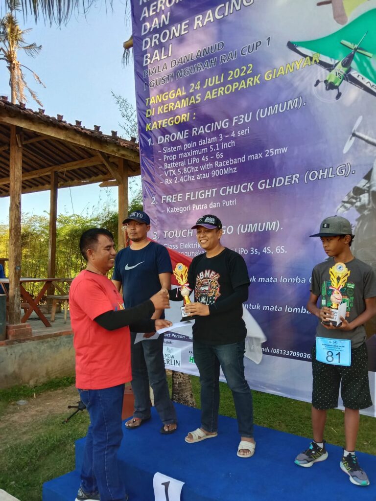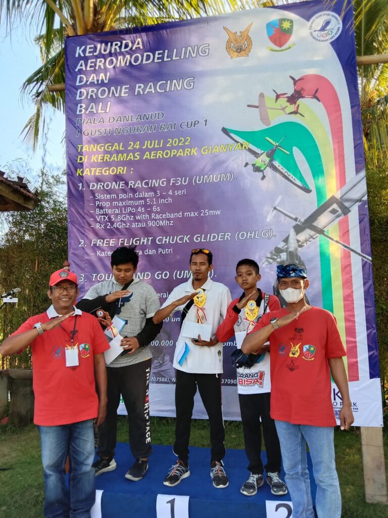 Hasil lengkap dari Kejurda Aeromodelling dan Drone Racing Bali “Danlanud I Gusti Ngurah Rai Cup I” yakni untuk Kategori Free Flight Chuck Glider (OHLG) Juara 1 I Putu Indra Nugraha (Kabupaten Buleleng), Juara 2 I Made Mas Surya Pranata (Kabupaten Badung), dan Juara 3 Berly Alynsky Putra Efendi (Kabupaten Badung).