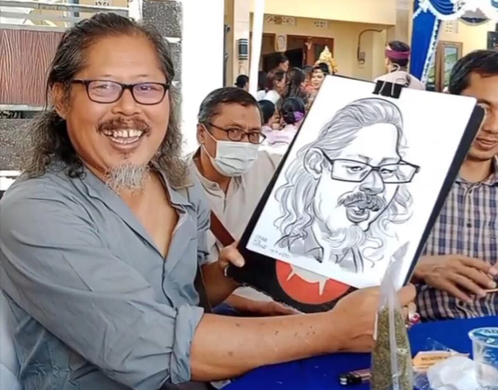 I Wayan Tama hanya butuh beberapa menit untuk membuat karikatur setiap tamu pernikahan. Dengan cekatan ia, menggoreskan pensil dan kuasnya di atas kertas putih. Dan jadilah karikaturnya.