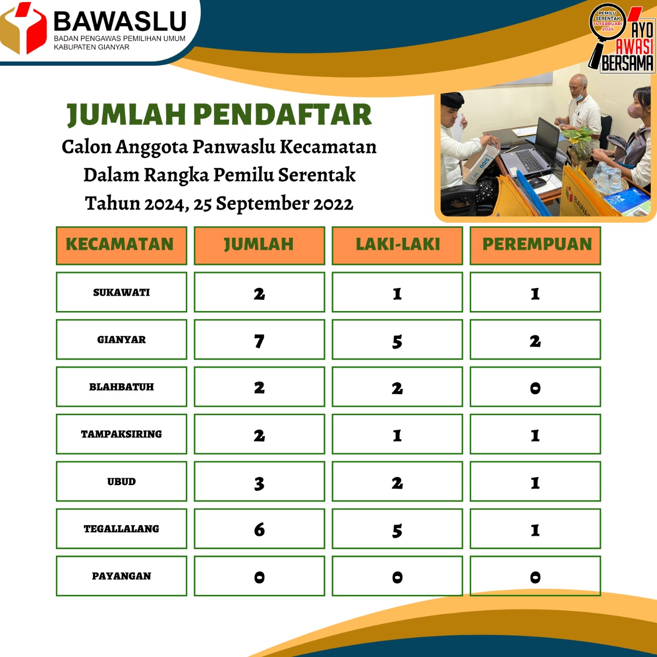 GIANYAR – Badan Pengawas Pemilu (Bawaslu) Kabupaten Gianyar saat ini sedang membuka pendaftaran Panitia Pengawas Pemilu Kecamatan (Panwaslucam). Namun, terdapat satu kecamatan yang belum