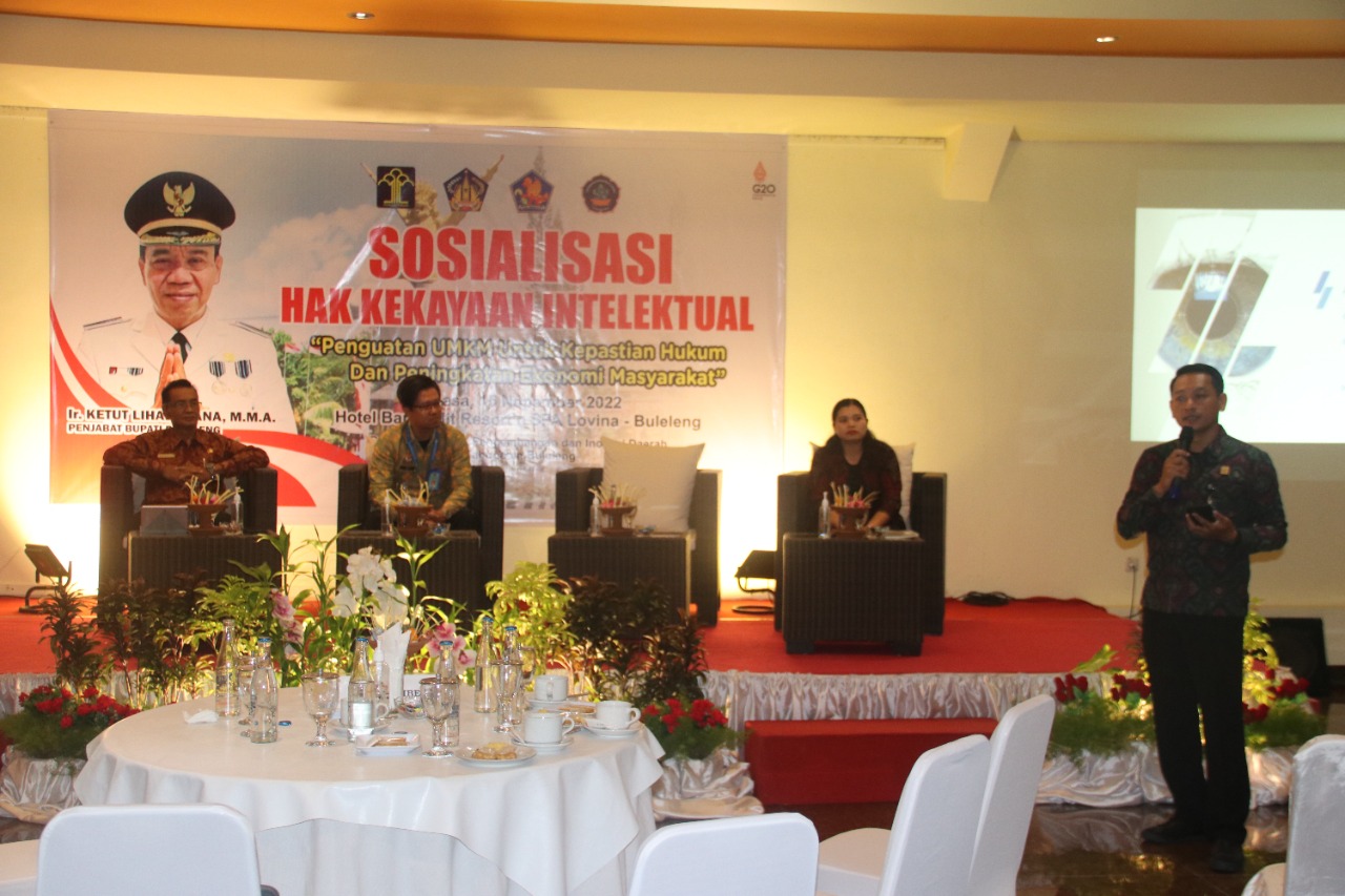 Pemahaman kesadaran masyarakat merupakan unsur penting dalam perlindungan dan pengembangan potensi HKI, baik komunal dan personal. Demikian sambutan PJ. Bupati Buleleng yang di bacakan Asisten Adminstrasi Umum Setda.Buleleng, Ir, Nyoman Genep, MM, saat membuka Sosialisasi HKI Penguatan UMKM di Hotel Banyualit SPA and Resort Lovina, Singaraja, Selasa (15/11/2022).