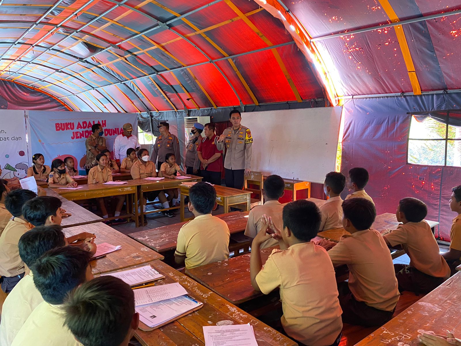 Kapolres Buleleng Sapa Anak-anak SD yang Belajar di Bawah Tenda