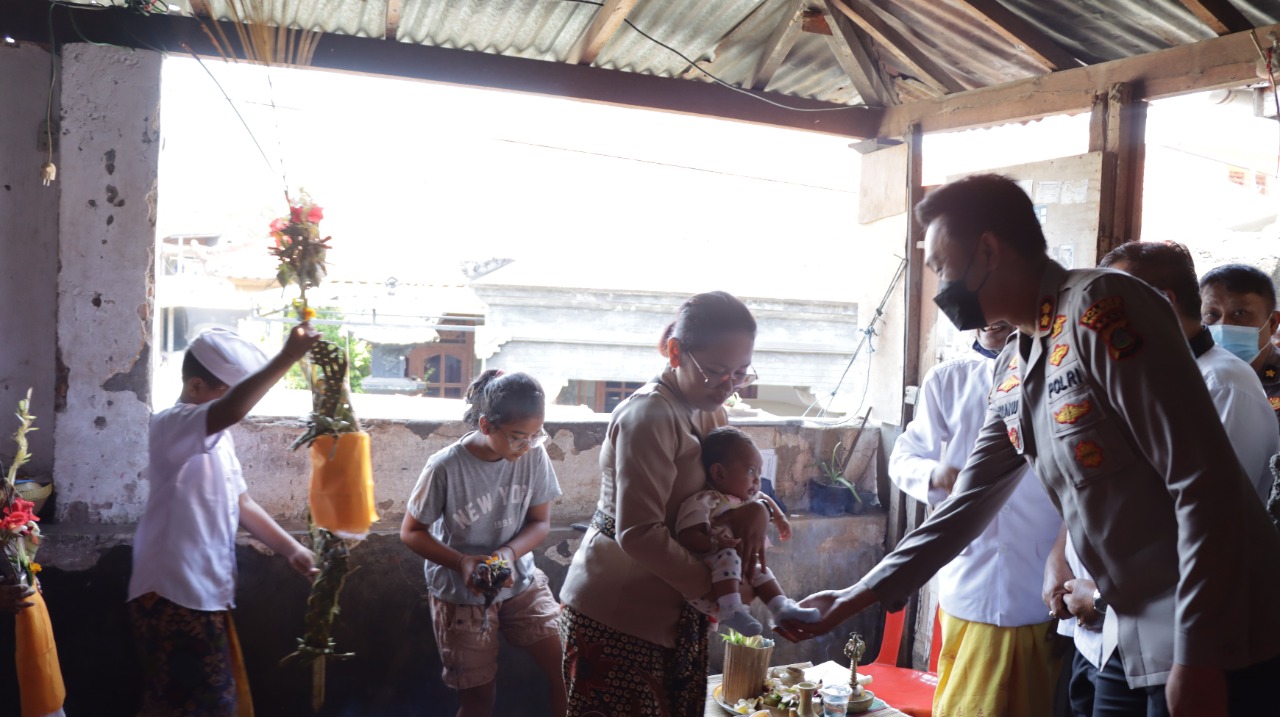 Putu Adi Suastika (47) yang bekerja sebagai pesuruh di salah satu sekolah dan anaknya yang berumur 15 bulan mengalami sakit lambat perkembangan, terdapat cairan otak dan tempat tinggalnya masih meminjam dari iparnya mendapat bantuan sembako dan selimut dari Kapolres Buleleng.