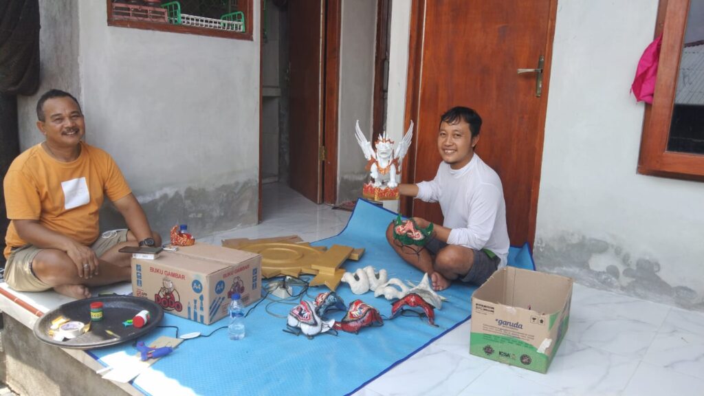 “Awalnya saya dipaksa sama Pak Camat, ya bagaimana saya sebelumnya cuma pelukis, tapi mungkin dilihat karena saya punya potensi jadi terus dipaksa sampai akhirnya saya coba dan benar-benar jadi sebuah karya seni dengan murni berbahan dari sampah yang bisa saya jual,” ungkap Sudiarta sambil mengerjakan pesanan miniatur patung singaambaraja yang terbuat dari sampah kertas dan plastik.