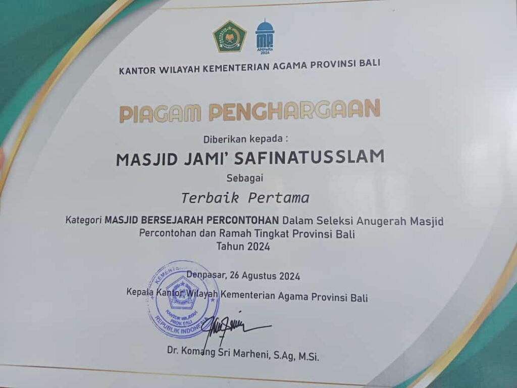 Ketua Pengurus Masjid Jami’ Safinatussalam Pegayaman, Rabihuddin, S.Ag., M.Pd.I, menerima langsung piagam dan sertifikat. Tampak hadir pada kesempatan pejabat di Kemenag Provinsi Bali.
