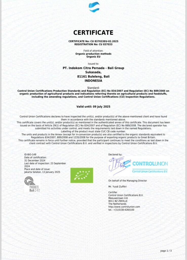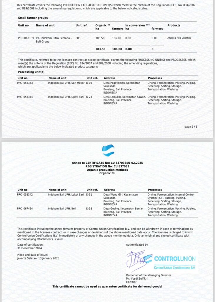 Inwan juga menegaskan, kopi arabika Pegayaman masih mengantongi sertifikat organik. Ia menunjukkan sertifikat organik dari ControlUnion Belanda yang masih berlaku. ”Kami tetap mempertahankan keorganikan ini. Karena ini merupakan keunggulan kopi arabika Pegayaman,” tegasnya.