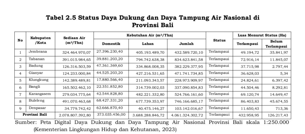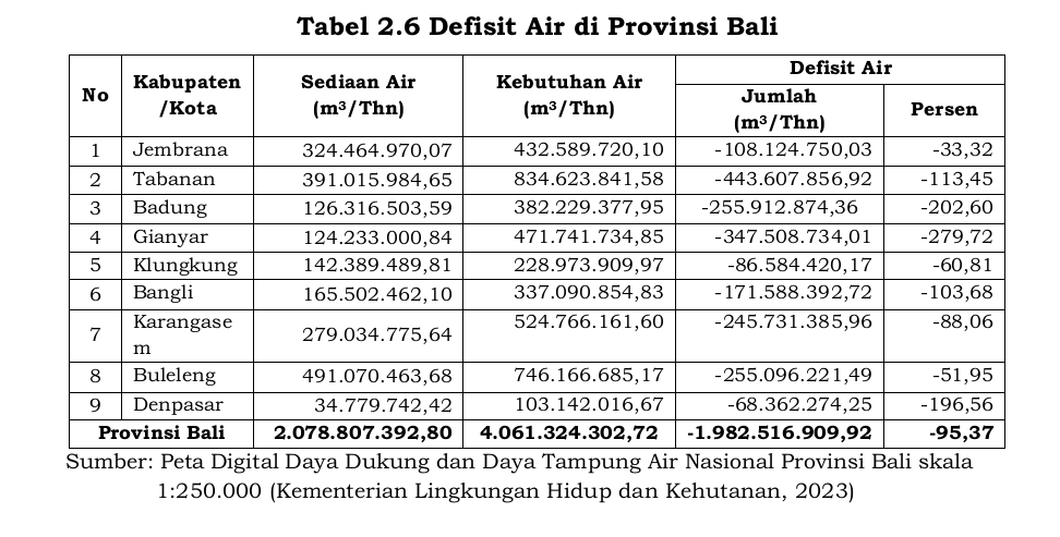 “Berdasarkan perbandingan antara ketersediaan dan kebutuhan air, Provinsi Bali mengalami defisit air yang signifikan dengan status daya dukung dan daya tampung air dikategorikan “terlampaui” di seluruh kabupaten/kota. Total defisit air mencapai sekitar 1,98 miliar m³ per tahun (-95,37%).”