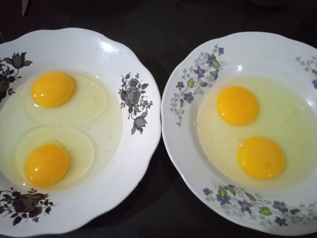 Penampakan fisik dari bagian dalam telur. Kiri: telur Omega 3. Kuning telur lebih tajam, kuning telur bulat dan cembung ke atas. Ada cincin yang melingkari kuning telur. Kanan: telur biasa. Kuning telur pipih dan kurang tajam