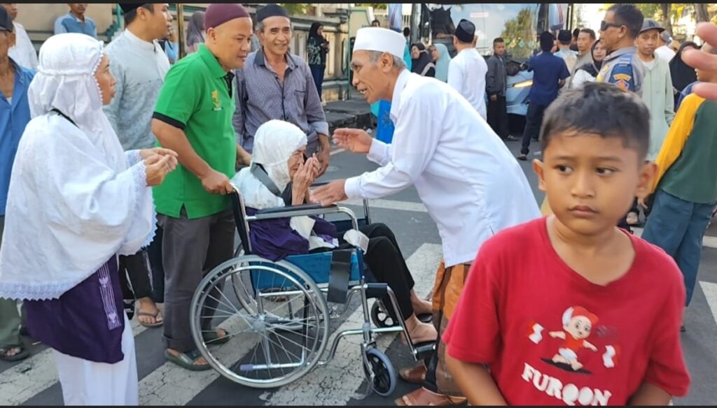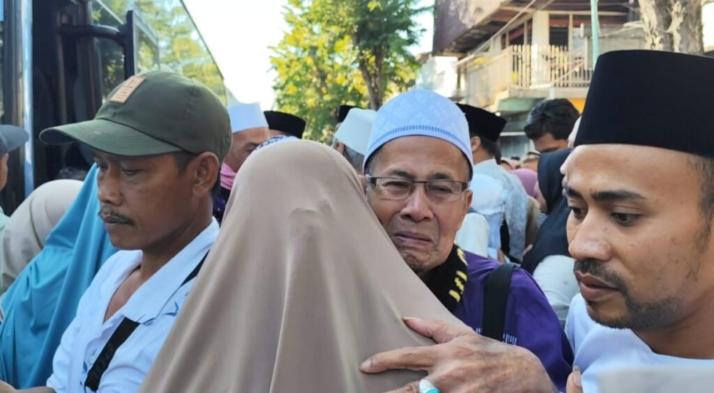 BULELENG – Tangis bahagia dan peluk haru terlihat ketika jemaah haji asal Buleleng turun bus yang membawanya dari Surabaya di Jl. Imam Bonjol, tepatnya di depan Masjid Agung Jami’ Singaraja, Jumat (4/7/2025) sore. Keluarga dan warga sudah menunggu kedatangan para jemaah haji tersebut sejak siang.