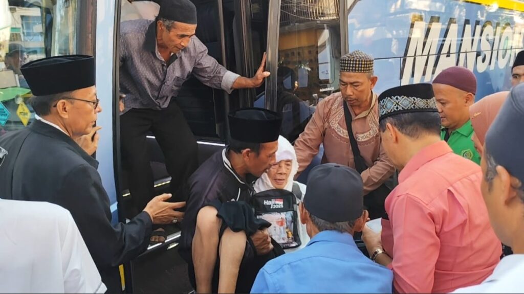 Begitu bus sampai, dan para jemaah haji turun satu per satu bus, warga dan keluarganya langsung menyambutnya. Ada yang meneteskan air mata bahagia, ada yang menahan tangis haru. Mereka langsung memeluk jemaah haji.