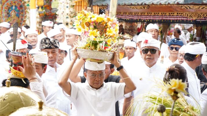 KARANGASEM – Gubernur Bali Wayan Koster menghadiri rangkaian Puncak Karya Ngenteg Linggih, Pedudusan Agung, Tawur Balik Sumpah, dan Nubung Pedagingan di Pura Titi Gonggang,