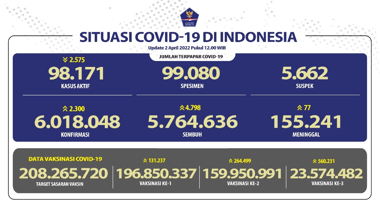 I. Nasional : 1). Konfirmasi 2.300 orang, sehingga menjadi 6.018.048 orang. 2). Sembuh 4.798 orang, sehingga menjadi 5.764.636 orang. 3). Meninggal 77 orang, sehingga