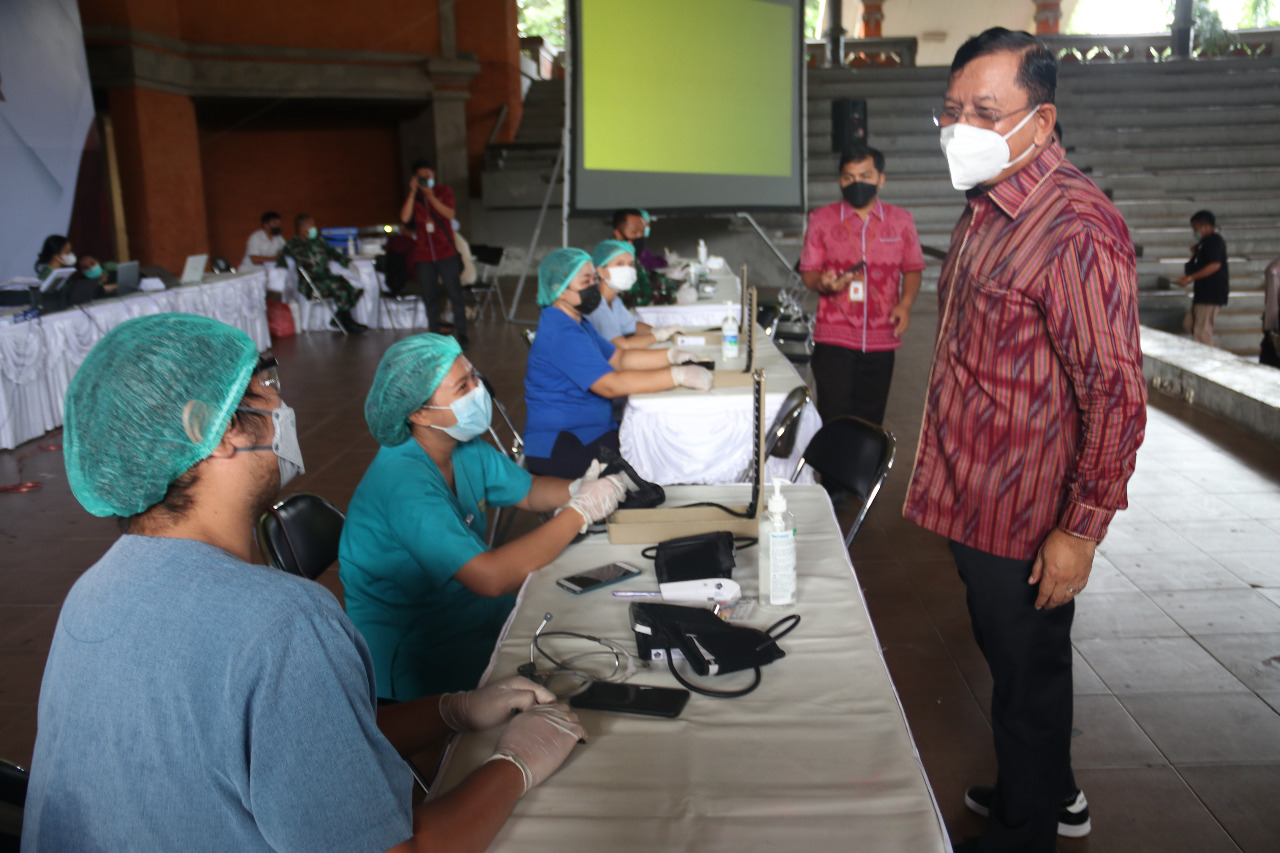 MANGUPURA – Sekretaris Daerah Kabupaten Badung sekaligus Ketua Forum Kerukunan Umat Beragama (FKUB), I Wayan Adi Arnawa, meninjau pelaksanaan vaksinasi booster yang diselenggarakan oleh